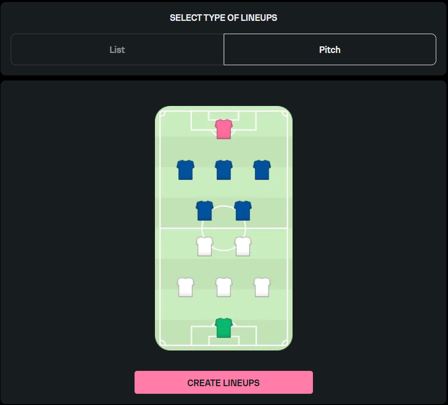 On the other hand, if you choose to create a lineup in the pitch mode, you will be able to choose the team’s kit color and the formation before placing each of the players into their place on the pitch.
