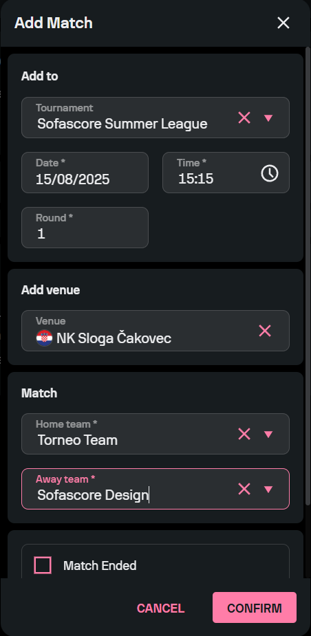 Fill in the form to select the participating teams, the time and date of the match, and, optionally, the venue where the match will be played. If the match you’re adding has already been played, tick the Match Ended box below the details to add the result.