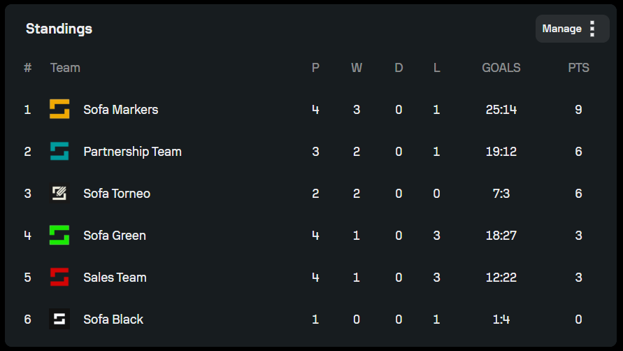 If you would like to manually adjust standings, click on the Manage button in the Standings tab. The Manage section allows you to edit points, manage promotions, manually reorder teams, and recalculate standings. Any manual changes will be immediately reflected in the Standings table.