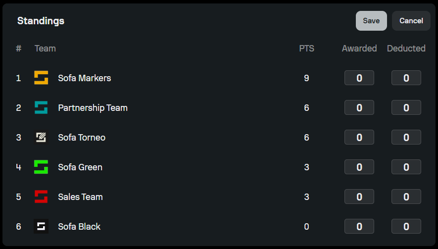 The Standings tab displays the current rankings of all teams in the competition. It automatically updates based on the results of the matches that have been entered. Please keep in mind that it might take some time to recalculate the standings once the match results have been added.