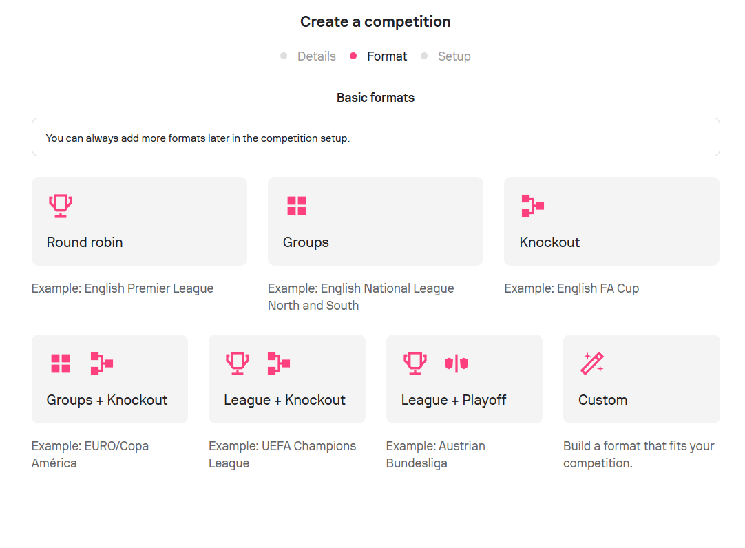 Keep in mind: Once matches are created, some format changes may no longer be available. Deleting a format may remove all related events and standings.