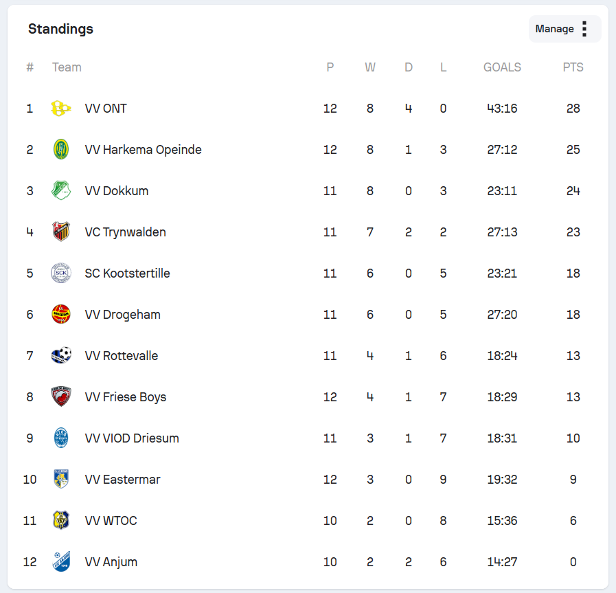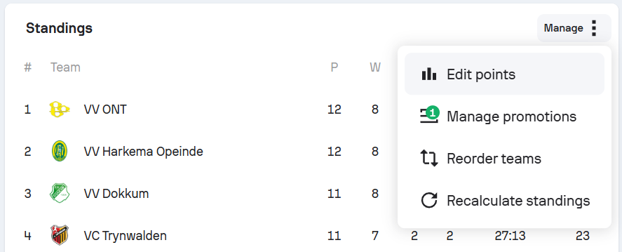 If needed, standings can be manually adjusted for administrative reasons (e.g., penalties, corrections). Sometimes it may take some time for any manual changes to be processed by the system and displayed in Torneo.