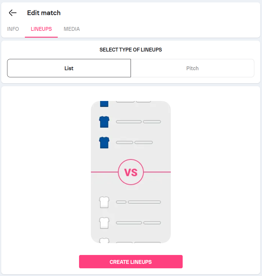 Lineups can be created either in the list mode or in the pitch mode and must be created for both teams.